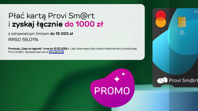 - Do 12.05.2026 r. zawrzeć umowę o kartę Provi Sm@rt z limitem do 5.000,00 zł lub limitem od 5.000 zł do 15.000 zł i wydać w pierwszym cyklu rozliczeniowym (jak najszybciej) odpowiednio co najmniej 300 zł lub 400 zł w zależności od limitu.
