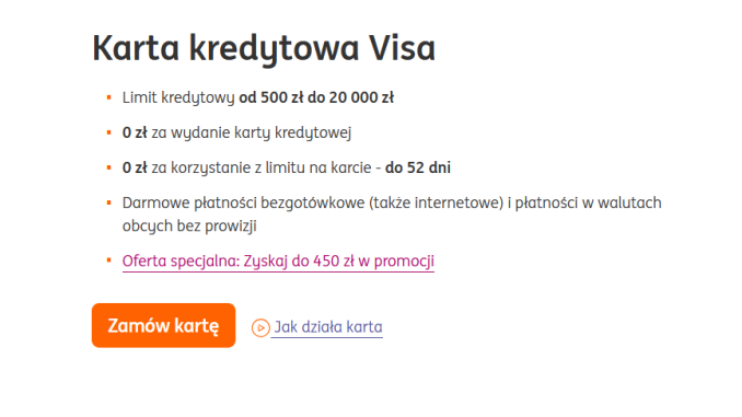 Za wydanie kartą w pierwszym miesiącu realizacji warunków otrzymuje się 150 zł, a za kolejne wydawania kartą po 200 zł w kolejnych miesiącach 3 x 50 zł. A jeżeli posiadamy kredyt hipoteczny czy pożyczkę hipoteczną to otrzymamy nawet 3 x 100 zł w drugiej turze. ING trochę skomplikowało warunki i bez rozpiski to trudno zrozumieć. Premię będą wpływać na rachunek karty kredytowej do 15-tego dnia następnego miesiąca następującego po miesiącu realizacji warunków. Wniosek o kartę kredytową należy złożyć przez bankowość mobilną lub internetową. Chyba muszę wreszcie udać się do ING i rozwiązać umowę o bankowość internetową. Da mi to przestrzeń do otrzymania kwoty 600 zł za konto i 300 zł za kartę kredytową. Wydanie standardowej karty jest bezpłatne – jest opłata roczna – 50 zł jeżeli nie wydajemy nią 500 zł miesięcznie. Ale po otrzymaniu nagrody zawsze można przemyśleć współpracę. Więcej na stronie promocji tutaj: