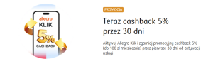 Dodatkowo akcja to Allegro Klik, nowy sposób płatności powiązany z kontem na Allegro. Po aktywacji tej metody płatności otrzymuje się promocyjny Cashback z płatności metodą Allegro Klik w wysokości 5% przez pierwsze 30 dni (akcja do 31.03.2026 r.) oraz Allegro Smart na 6 miesięcy za 1 zł. Cashback pojawia się na koniec już następnego dnia. Maksymalnie można otrzymać 100 zł miesięcznie, 1.200 zł w ciągu roku (a nawet 1.300 zł jak się Allegro Klik aktywuje w innym dniu niż 1 dzień miesiąca. Standardowy Cashback to 1%, 2% jeżeli na koncie odnotuje się wpływ 2.000 zł. Dodatkowy 1% jest „jeśli skorzystasz z jednego ze wskazanych produktów oferowanych przez bank lub za jego pośrednictwem (na czas umowy o ten produkt)”. Promocja dobra dla tych, którzy sporo kupują na Allegro ale trzeba uważać na wyłączenia na różne produkty (np. spis tutaj). Obecna akcja trwa do 30.06.2026 r. a więcej o niej na stronie PKO BP tutaj.