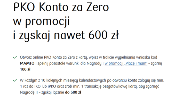 Należy podać przy otwieraniu konta kod promocji: MAMTO. Pierwsza nagroda to niejako 100 zł na start a druga nagroda to 5% zwrot za transakcje bezgotówkowe w kolejnych 10 miesiącach następujących po miesiącu otwarcia konta, maksymalnie 50 zł miesięcznie i 500 zł w ciągu kolejnych miesięcy. Zwroty będą dopisywane do konta do końca następnego miesiąca po miesiącu wykonania odpowiednich transakcji. Należy także logować się też co miesiąc do IKO i/lub iPKO. Należy także mieć wyrażone cały czas zgody marketingowe i handlowe. Transakcje BLIK się nie liczą. W promocji można otworzyć maksymalnie 1 konto dla siebie i po 1 koncie dla każdego dziecka, którego jest się przedstawicielem ustawowym czym poniżej.